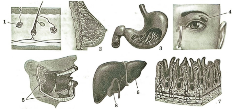 Установите соответствие между характеристиками и железами, обозначенными на рисунке цифрами 1, 2, 3: к каждой позиции, данной в первом столбце, подберите соответствующую позицию из второго столбца.