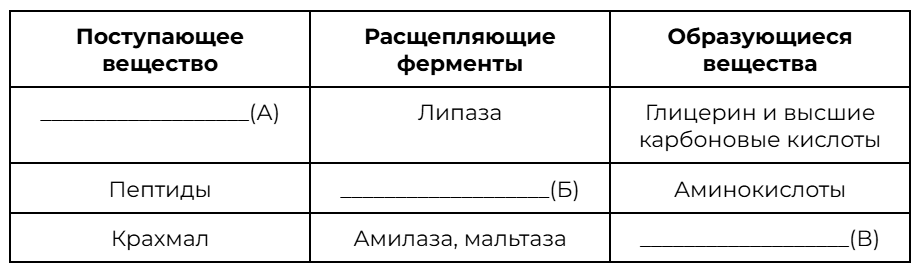Проанализируйте таблицу «Расщепление органических веществ в тонком кишечнике у млекопитающих». Заполните пустые ячейки таблицы, используя элементы, приведенные в списке. Для каждой ячейки, обозначенной буквой, выберите соответствующий элемент из предложенного списка.
