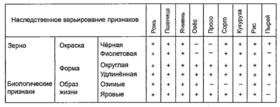 Проанализируйте таблицу «Наследственное варьирование признаков у злаковых растений». Заполните пустые ячейки таблицы, используя элементы, приведённые в списке. Для каждой ячейки, обозначенной буквой, выберите соответствующий элемент из предложенного списка.