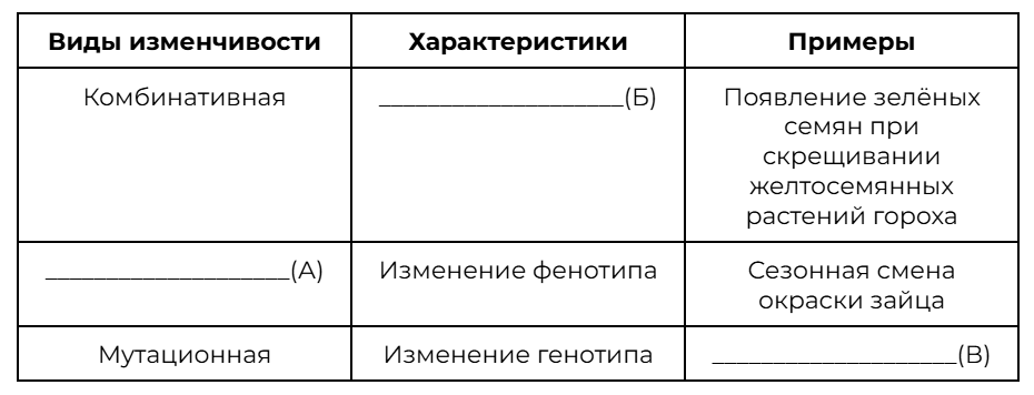 Проанализируйте таблицу «Виды изменчивости». Заполните пустые ячейки таблицы, используя элементы, приведенные в списке. Для каждой ячейки, обозначенной буквой, выберите соответствующий элемент из предложенного списка.