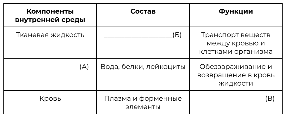 Проанализируйте таблицу «Компоненты внутренней среды человека». Заполните пустые ячейки таблицы, используя элементы, приведенные в списке. Для каждой ячейки, обозначенной буквой, выберите соответствующий элемент из предложенного списка.