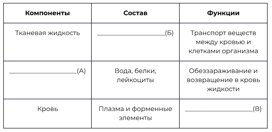 Проанализируйте таблицу «Состав и функции внутренней среды человека». Заполните пустые ячейки таблицы, используя элементы, приведённые в списке. Для каждой ячейки, обозначенной буквой, выберите соответствующий элемент из предложенного списка.