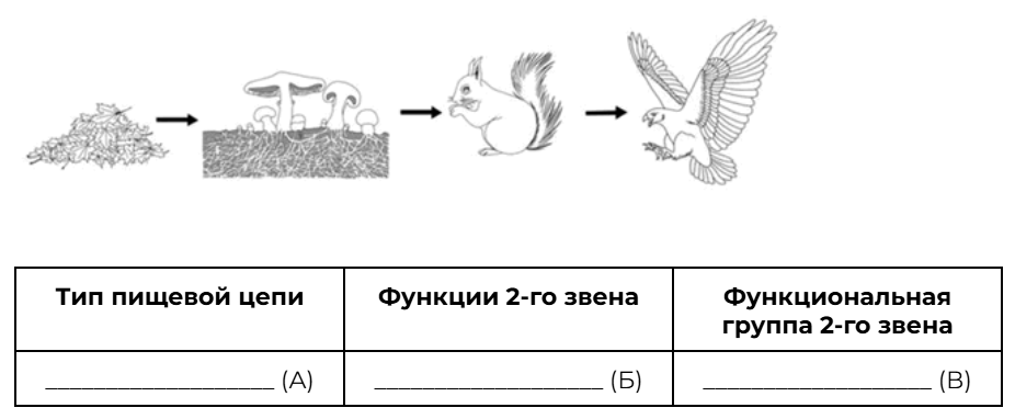 Рассмотрите схему пищевой цепи. Заполните пустые ячейки таблицы, используя элементы, приведённые в списке. Для каждой ячейки, обозначенной буквой, выберите соответствующий элемент из предложенного списка.