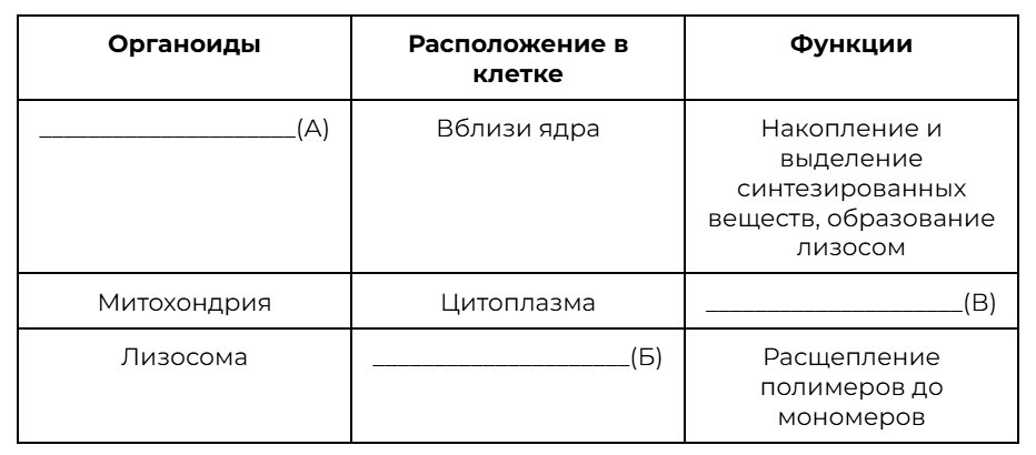 Проанализируйте таблицу «Органоиды клетки». Заполните пустые ячейки таблицы, используя элементы, приведённые в списке. Для каждой ячейки, обозначенной буквой, выберите соответствующий элемент из предложенного списка.