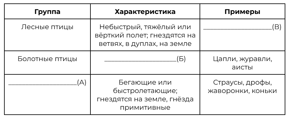 Проанализируйте таблицу +Экологические группы птиц». Заполните пустые ячейки таблицы, используя элементы, приведённые в списке. Для каждой ячейки, обозначенной буквой, выберите соответствующий элемент из предложенного списка.