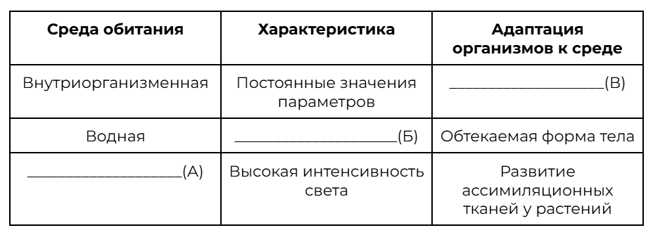 Проанализируйте таблицу «Среды обитания». Заполните пустые ячейки таблицы, используя элементы, приведённые в списке. Для каждой ячейки, обозначенной буквой, выберите соответствующий элемент из предложенного списка.