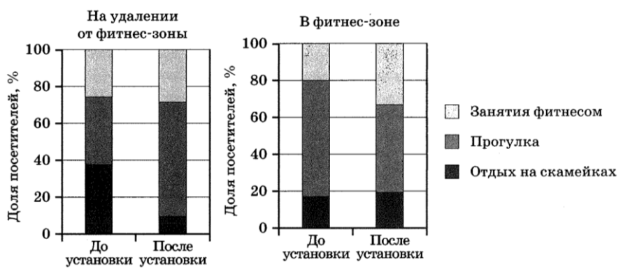 Проанализируйте диаграмму «Активность жителей, отдыхающих в парке, до и после установки тренажеров в фитнес-зоне», если численность посетителей парка после установки тренажеров не изменилась.