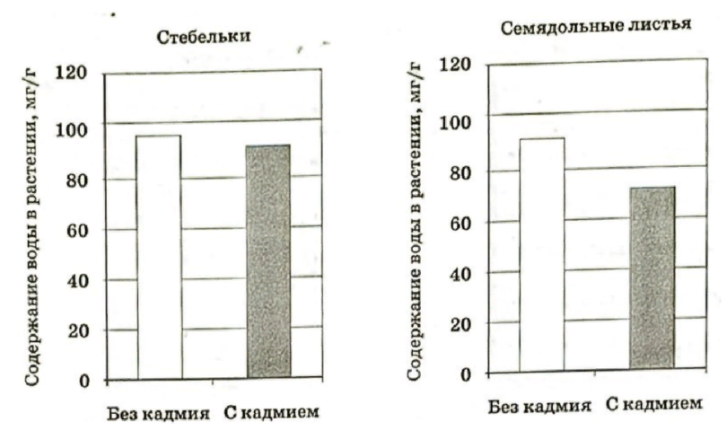 Проанализируйте диаграмму, на которой представлено содержание воды в стебельках и семядольных листьях проростков гречихи. Половину семян поливали водой без кадмия, а другую половину — с добавлением кадмия.
