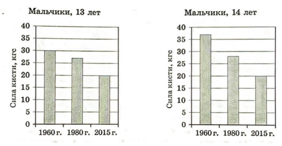 Проанализируйте диаграммы, на которых представлена мышечная сила (в кгс) правой кисти мальчиков в возрасте 13-14 лет в разные годы.