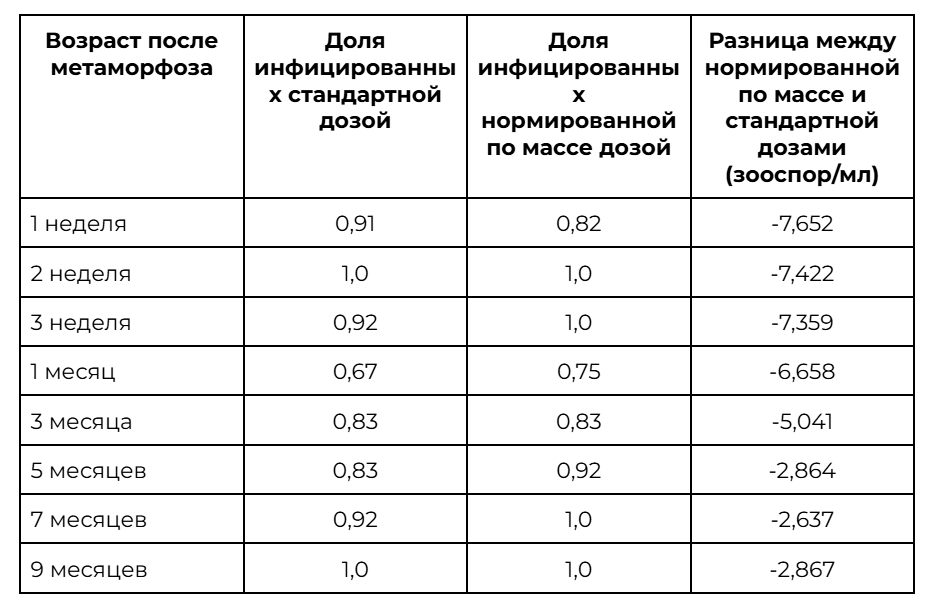 Проанализируйте таблицу «Заражение тихоокеанской древесной лягушки (Pseudacris regilla) болезнетворным грибком». В эксперименте лягушкам давалась стандартная доза зооспор грибка и нормированная по массе доза зооспор (зависящая от массы лягушки).