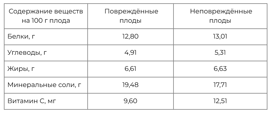 Проанализируйте таблицу «Содержание питательных веществ в спелых плодах банана, поврежденных и неповрежденных древоточцем».