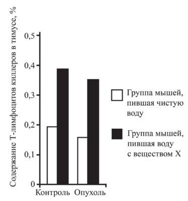 вещества Х». В эксперименте использовали мышей с раковой опухолью, и качестве контроля использовали здоровых мышей. В каждой группе одну часть мышей поили чистой водой, а другую — водой с добавлением вещества Х. Через 14 дней брали на анализ тимус (вилочковую железу).