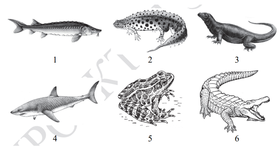 Под каким номером на рисунке изображено позвоночное животное с полностью хрящевым скелетом, обитающее в морях?