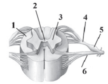 Выберите три верно обозначенные подписи к рисунку, на котором изображён участок спинного мозга человека.