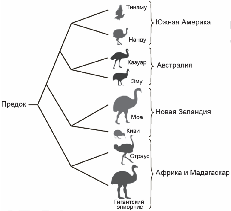 На схеме представлены филогенетическое дерево птиц из группы Древненёбных (Paleognathae), а также информация об их современных ареалах и местах ископаемых находок (для вымерших птиц). На основании представленных данных укажите название суперконтинента, где возникла группа древненёбных, и порядок, в котором от этого суперконтинента отделялись участки суши. Какая геологическая теория лежит в основе данных процессов? К какой группе доказательств эволюции можно отнести данный пример? Описанная закономерность в распространении наблюдается далеко не для всех групп животных. Какие причины могут приводить к нарушению этой закономерности?