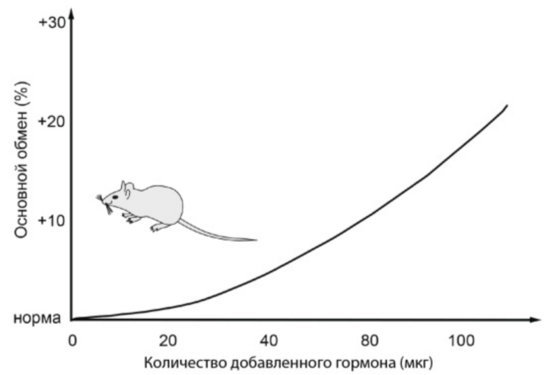 Экспериментатор решил изучить процессы основного обмена (обмена веществ) у домовой мыши (Mus musculus). Для этого он вводил в брюшную полость мышам физиологический раствор с гормоном щитовидной железы в разных дозировках и кормил их фиксированным количеством корма. (В норме у мыши синтезируется в сутки 15 мкг гормона.) Результаты эксперимента представлены на графике.