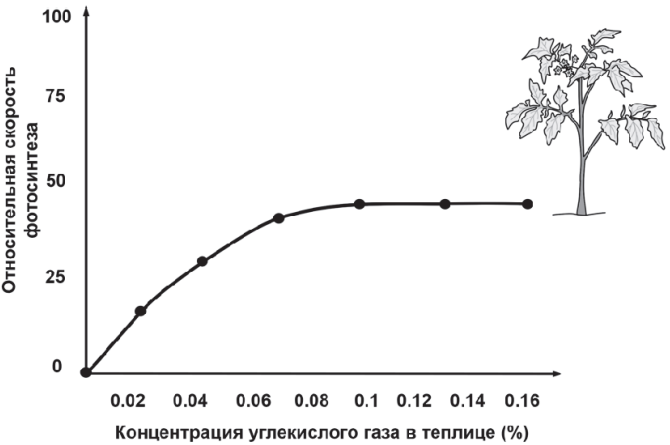 Учёный изучал влияние различных экологических факторов на процесс фотосинтеза. Свой эксперимент исследователь проводил в специальной теплице, где были высажены 300 растений томата сорта Шапка Мономаха. В герметичную теплицу с определённой периодичностью закачивался воздух с различным количеством углекислого газа. С помощью датчиков учёный фиксировал показатели скорости фотосинтеза, которые приведены на графике ниже.