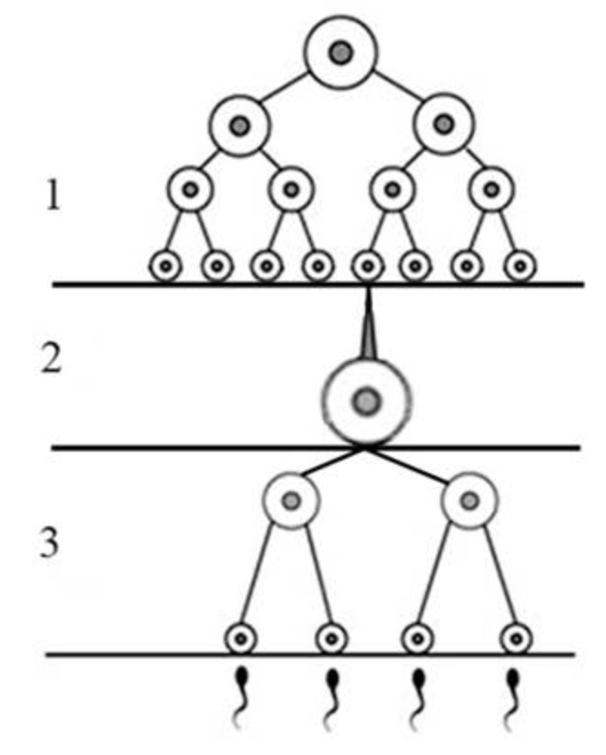 Установите соответствие между процессами и зонами гаметогенеза, обозначенными на рисунке цифрами 1, 2, 3: к каждой позиции, данной в первом столбце, подберите соответствующую позицию из второго столбца.
