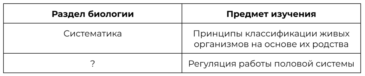 Рассмотрите таблицу «Биология – комплексная наука». Запишите в ответе пропущенный термин, обозначенный в таблице вопросительным знаком.