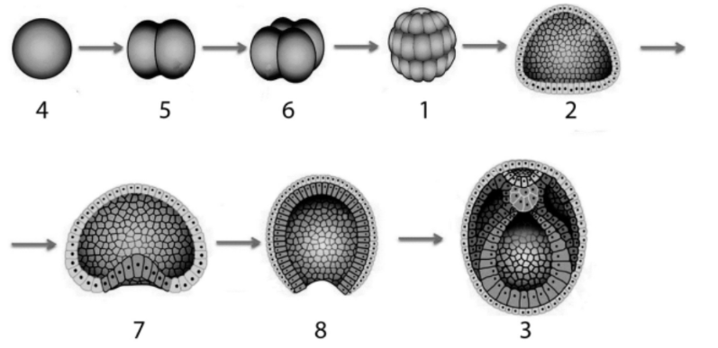 Установите соответствие между процессами и этапами эмбриогенеза организма, обозначенными на схеме выше цифрами 1, 2, 3: к каждой позиции, данной в первом столбце, подберите соответствующую позицию из второго столбца.