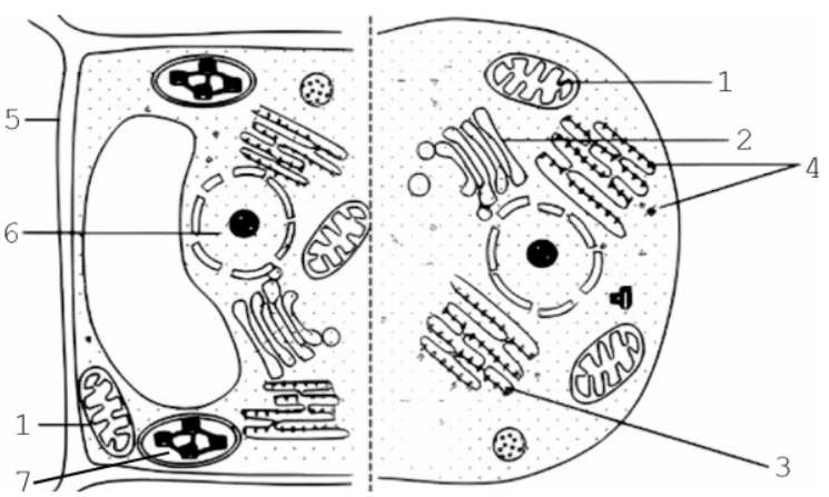 Каким номером на рисунке обозначена структура клетки, содержащая диплоидный набор хромосом?