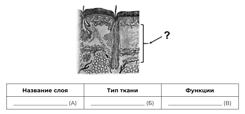 Рассмотрите рисунок с изображением строения кожи человека. Укажите название, функцию слоя кожи, обозначенного вопросительным знаком. Определите тип ткани, которая его образует. Заполните пустые ячейки, используя понятия и функции, приведённые в списке. Для каждой ячейки, обозначенной буквой, выберите соответствующий элемент из предложенного списка.