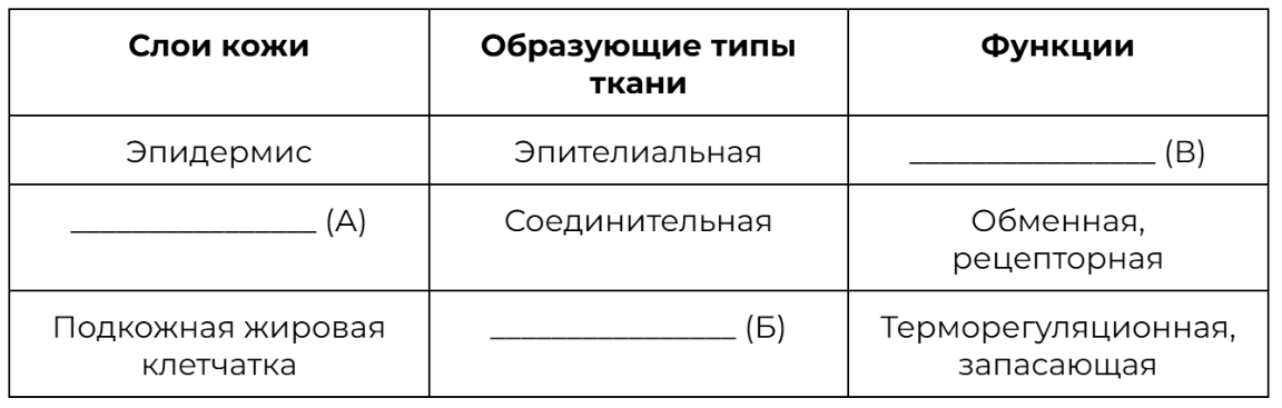 Проанализируйте таблицу «Строение кожи человека». Заполните пустые ячейки таблицы, используя термины и понятия, приведённые в списке. Для каждой ячейки, обозначенной буквой, выберите соответствующий элемент из предложенного списка.