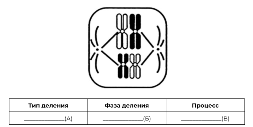 Рассмотрите рисунок со схематичным изображением деления ядра клетки и заполните пустые ячейки таблицы, используя элементы, приведённые в списке. Для каждой ячейки, обозначенной буквой, выберите соответствующий элемент из предложенного списка.