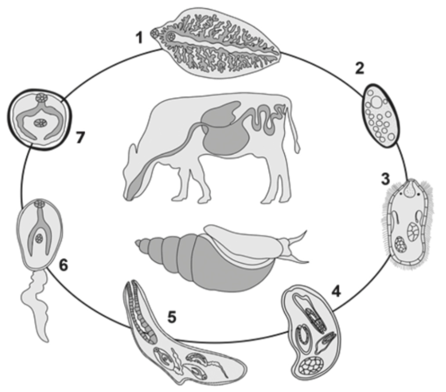 Каким номером на рисунке обозначена стадия жизненного цикла паразита, которая попадает в окончательного хозяина?