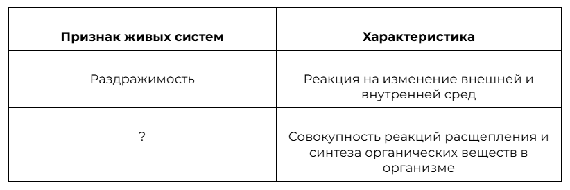 Рассмотрите таблицу «Признаки живых систем». Запишите в ответе пропущенный термин, обозначенный в таблице вопросительным знаком.