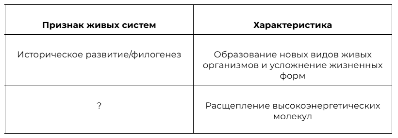 Рассмотрите таблицу «Признаки живых систем». Запишите в ответе пропущенный термин, обозначенный в таблице вопросительным знаком.