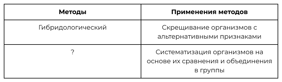 Рассмотрите таблицу «Методы биологических исследований». Запишите в ответе пропущенный термин, обозначенный в таблице вопросительным знаком.