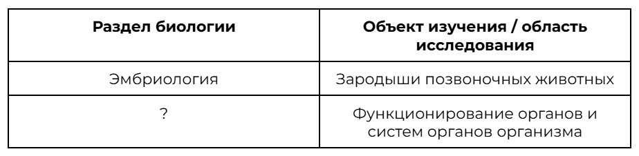 Рассмотрите таблицу «Биология как наука». Запишите в ответе пропущенный термин, обозначенный в таблице вопросительным знаком.