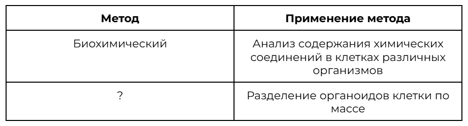 Рассмотрите таблицу «Методы биологических исследований». Запишите в ответе пропущенный термин, обозначенный в таблице вопросительным знаком.