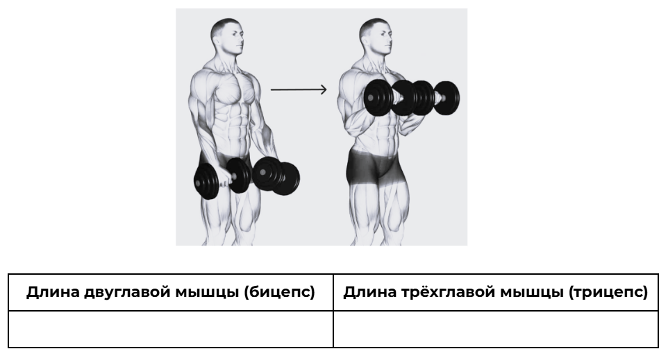 В эксперименте исследователь определял состояние мышц верхней конечности при упражнении с гантелями. Как изменились длины двуглавой (бицепс) и трёхглавой (трицепс) мышц при разгибании рук в сравнении с первоначальным положением?