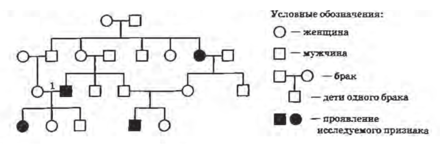 По изображенной на схеме родословной человека определите вероятность (%) рождения в браке, отмеченном цифрой 1, ребёнка с признаком, обозначенным черным цветом, при полном его доминировании. В ответе запишите только соответствующее число.