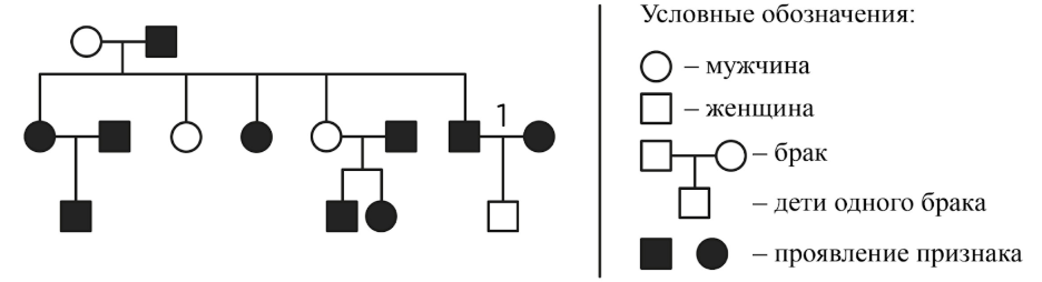 По изображённой на рисунке родословной определите вероятность (%) рождения в браке, отмеченном цифрой 1, ребёнка с проявившимся признаком при полном его доминировании. В ответе запишите только соответствующее число.