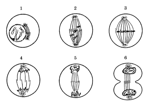 Каким номером на рисунках обозначена фаза митоза, на которой происходит распределение митохондрий между дочерними клетками?