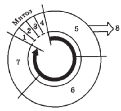 Укажите номер, обозначающий на схеме стадию клеточного цикла, во время которой происходит удвоение ДНК.