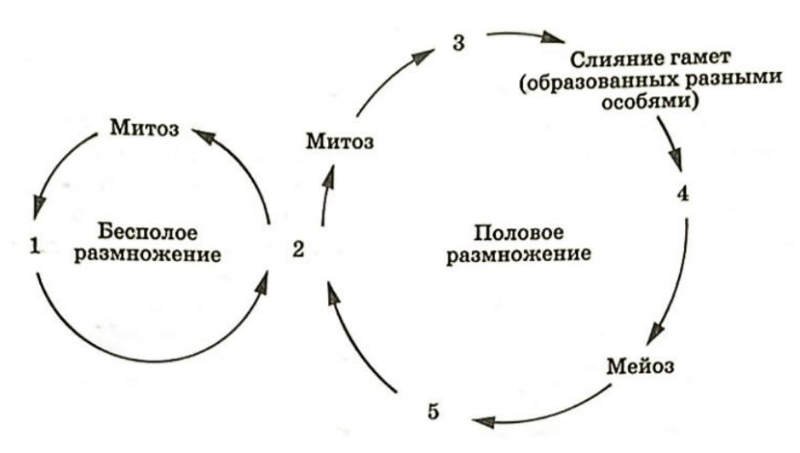 Каким номером на рисунке обозначена диплоидная стадия жизненного цикла?