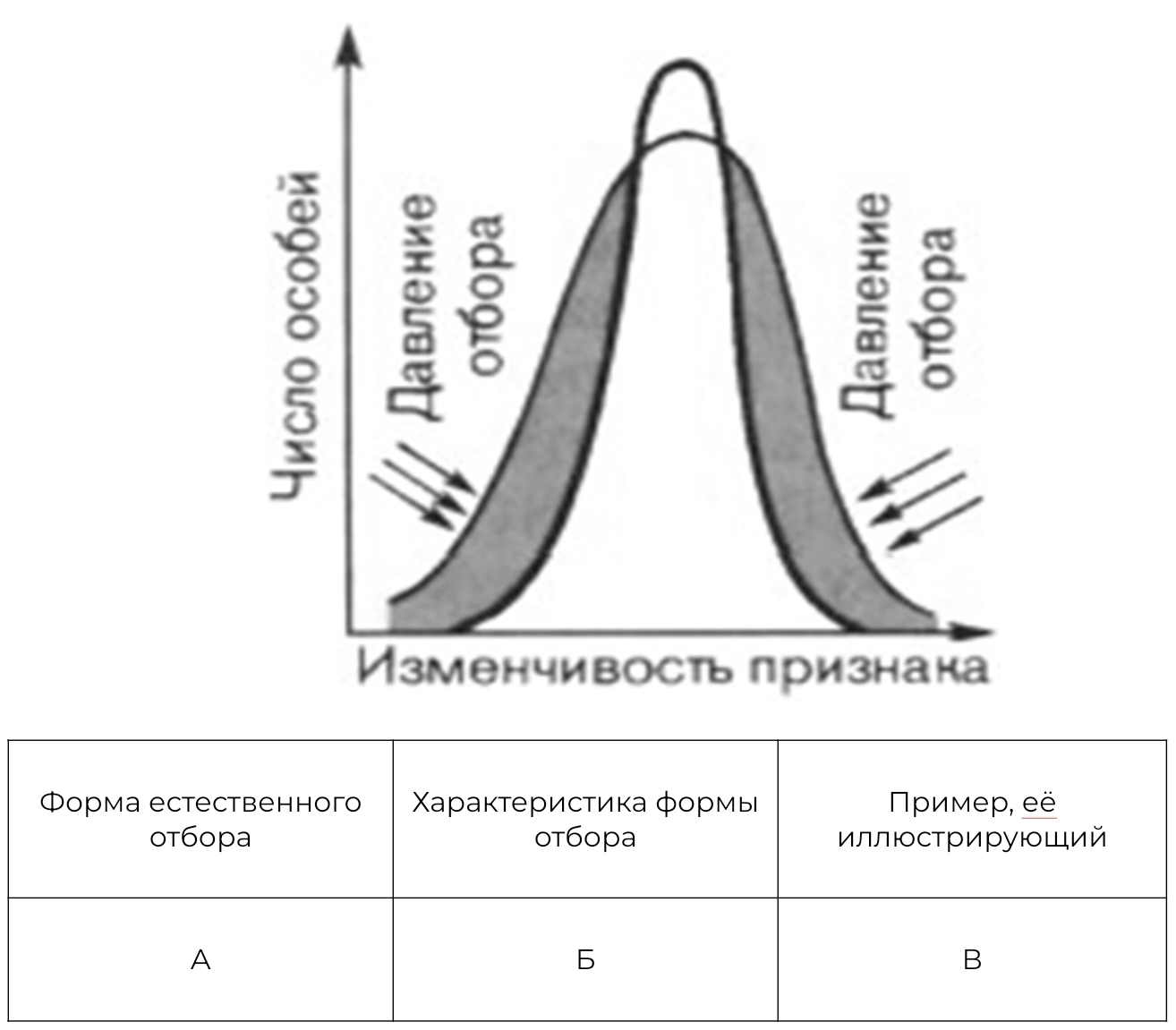 Рассмотрите график «Форма естественного отбора». Заполните пустые ячейки таблицы, используя элементы, приведенные в списке. Для каждой ячейки, обозначенной буквой, выберите соответствующий элемент из предложенного списка