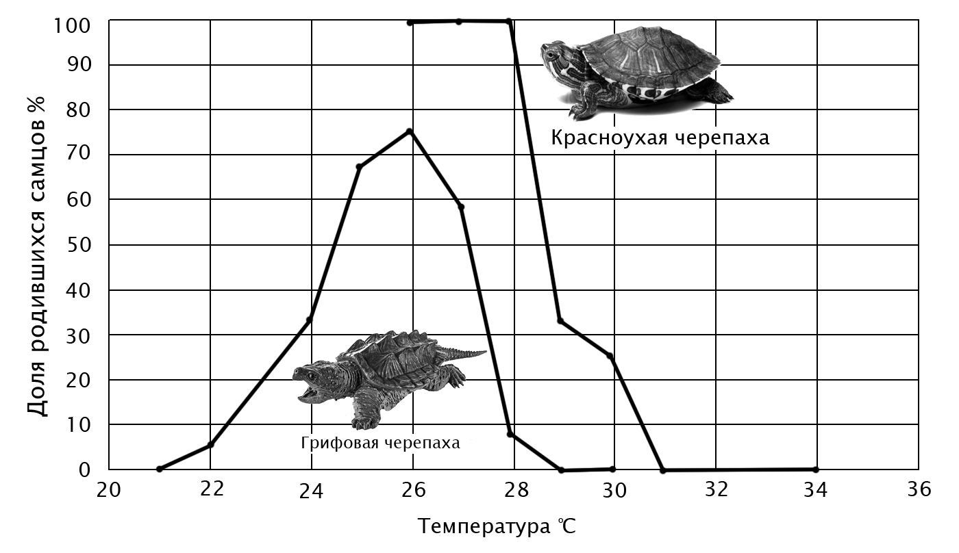 Проанализируйте график “Влияние температуры кладки на формирование пола у эмбрионов черепах”.