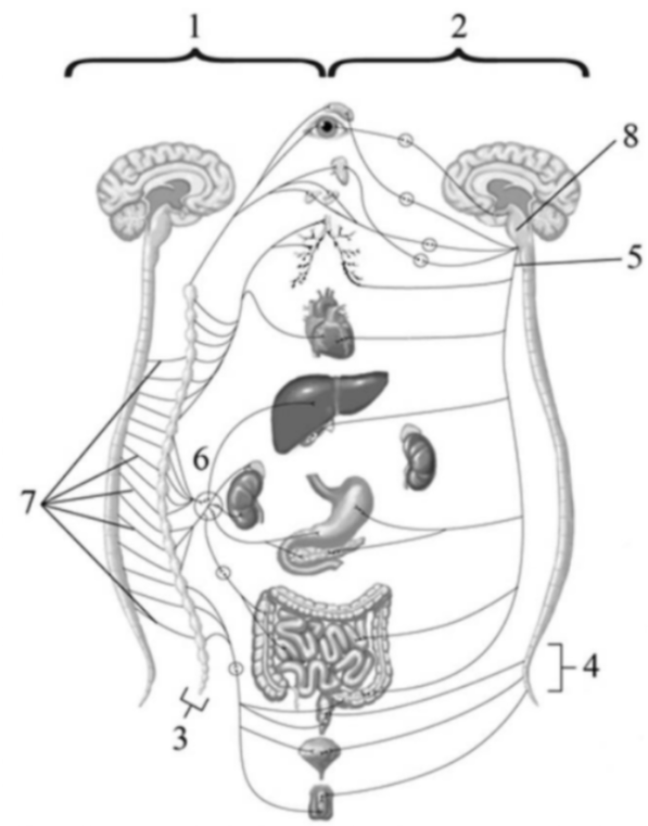 Установите соответствие между характеристиками и отделами вегетативной нервной системы человека, обозначенными на рисунке выше цифрами 1 и 2: к каждой позиции, данной в первом столбце, подберите соответствующую позицию из второго столбца.