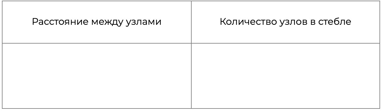 В исследовании учёный измерял некоторые параметры развития стебля соломины пшеницы в фазе выхода в трубку в течение нескольких месяцев. Как в процессе развития растения изменились расстояния между узлами и количество узлов в стебле?