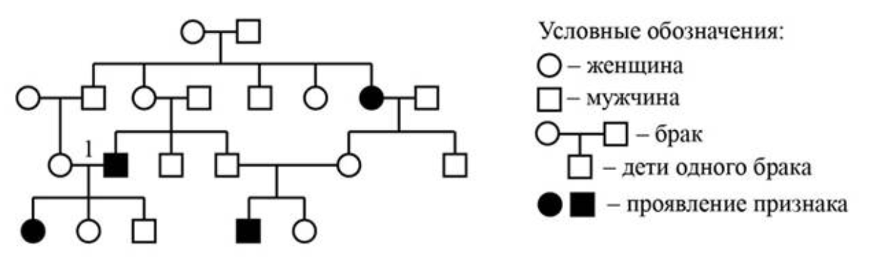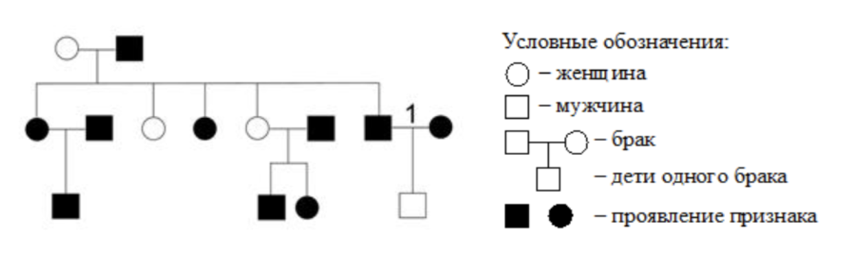 По изображённой на схеме родословной человека определите вероятность (%) рождения в браке, отмеченном цифрой 1, ребёнка с признаком, обозначенным чёрным цветом, при полном его доминировании. В ответе запишите только соответствующее число.