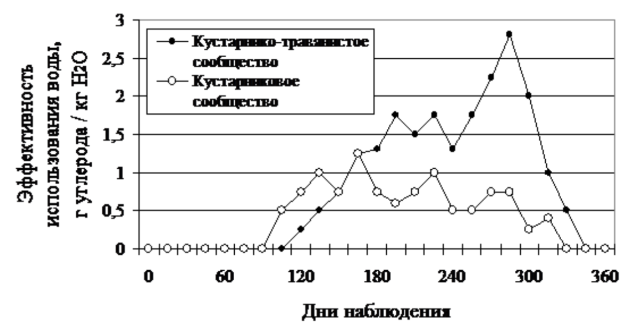 Проанализируйте график изменения эффективности использования воды в фотосинтезе двух экосистем в течение года.
