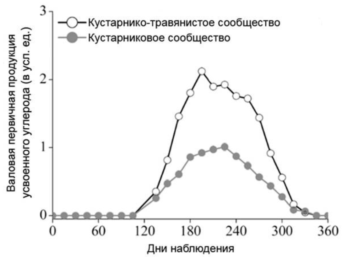 Проанализируйте график изменения валовой первичной продукции двух экосистем в течение года. Видовой состав кустарников в исследуемых экосистемах одинаков.