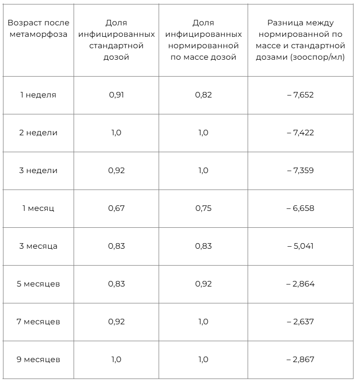 Проанализируйте таблицу «Заражение тихоокеанской древесной лягушки (Pseudacris regilla) болезнетворным грибком». В эксперименте лягушкам давалась стандартная доза зооспор грибка и нормированная по массе доза зооспор (зависящая от массы лягушки).