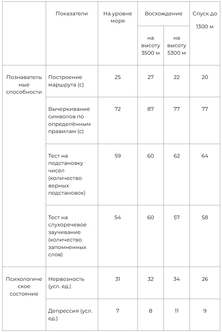 Проанализируйте таблицу «Показатели познавательных способностей и психологического состояния у туристов при восхождении на Эверест и спуске с горы».