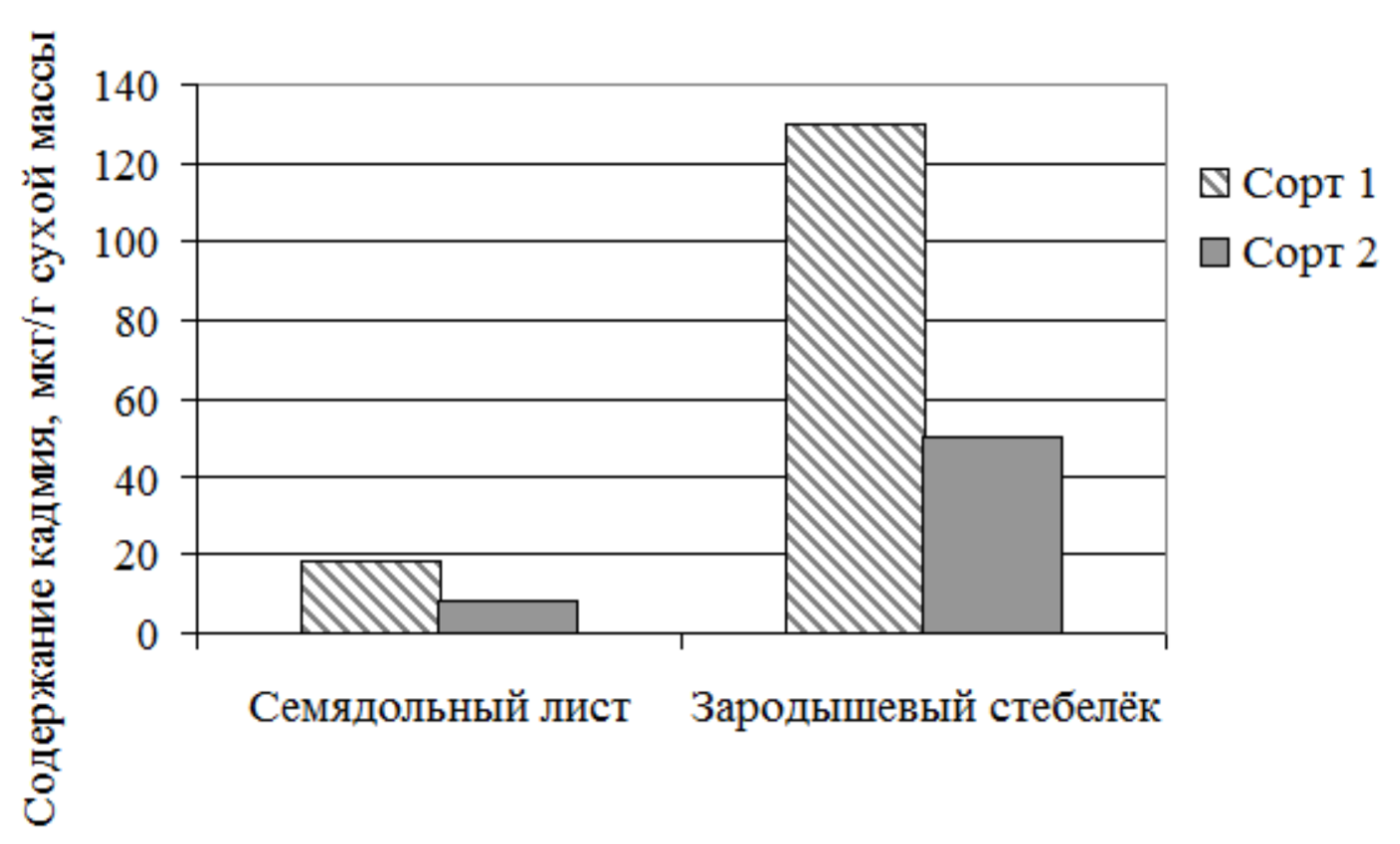 Проанализируйте диаграмму, на которой представлено содержание кадмия в различных органах проростков двух сортов гречихи. Семена гречихи проращивали в кадках, поливая их водой с добавлением солей кадмия.